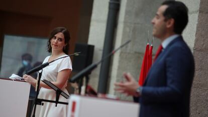 Hay codazos y codazos. Lo bueno del nuevo saludo pandémico es que, aunque te lleves mal con el que saludas, ya le estás dando un codazo. La mañana en la Puerta del Sol comenzó entre codazos de diputados del PP y Ciudadanos. Era un día de sonrisas, de alegrías. Por haber, hubo hasta abrazos ―casi prohibidos en la nueva era― entre miembros del mismo partido. Se cumplía un año de la firma del primer acuerdo de Gobierno de coalición de la Comunidad. 365 días en los que la región aún no cuenta con presupuestos, no ha sacado adelante ni una sola ley y en el que, durante la pandemia, la gestión de las residencias y de los hospitales ha abierto una brecha aún mayor dentro del Ejecutivo. Tanto, que hasta la presidenta, Isabel Díaz Ayuso, se planteó adelantar las elecciones con tal de romper el acuerdo con su socio de Gobierno. Poca broma. Para conmemorar todo esto, el Ejecutivo convocó a los consejeros, a más de 40 diputados autonómicos de ambos partidos y a la prensa, sin admitir preguntas tras las intervenciones. ¿La oposición? Ni rastro.