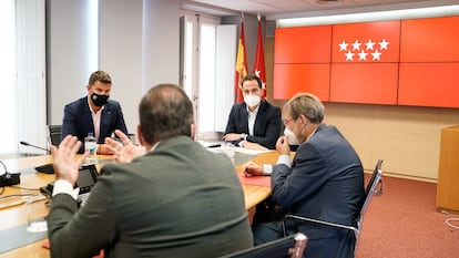 Cs y Vox, los dos partidos que han permitido que Isabel Díaz Ayuso (PP) gobierne la Comunidad de Madrid, quedaron desconcertados el miércoles por el anuncio de que el Gobierno se disponía a ordenar confinamientos selectivos en la región, inmediatamente desmentido. Ignacio Aguado, líder regional del partido de Inés Arrimadas, renunció a dar la rueda de prensa que ofrece todas las semanas tras el Consejo de Gobierno para no ser preguntado al respecto, aunque este jueves respaldó públicamente a la presidenta. Rocío Monasterio, por su parte, criticó sin paños calientes al Ejecutivo, que estudia presentar nuevas restricciones hoy.
