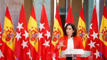 Con una veintena de banderas de España y de la Comunidad de Madrid como telón de fondo, la presidenta de Madrid tuvo una actitud distinta. Dejó algunos reproches para la estrategia del Gobierno. Y reclamó, una vez constituida la mesa de coordinación a la que aspiraba para comunicar directamente a las dos Administraciones, que Madrid reciba un trato especial.