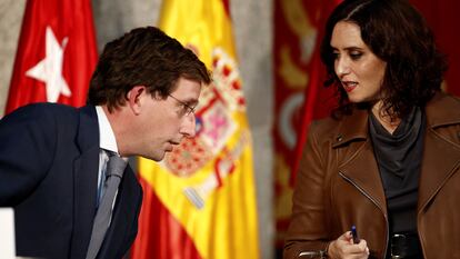 El alcalde de Madrid, José Luis Martínez-Almeida y la presidenta de la Comunidad de Madrid, Isabel Díaz Ayuso, en el edificio de la Puerta del Sol. En vídeo, sus declaraciones. Vídeo: JAVIER LÓPEZ / EFE | ATLAS