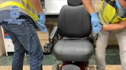 Ante las preguntas de los agentes este individuó mostró una actitud nerviosa y contradictoria lo que motivó un registro de su equipaje facturado, según afirma la Jefatura Superior de Policía Nacional. Entre sus pertenencias había una silla de ruedas eléctrica de su propiedad que contaba con un doble fondo tanto en el asiento como en el respaldo.