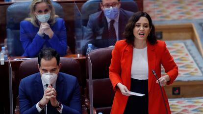 Tras el silencio, el ruido. El pleno de la Asamblea de Madrid ha comenzado este jueves con un sentido homenaje en memoria de Santos González, trabajador de Metro fallecido tras ser diagnosticado de asbestosis, y de Flora, asesinada en enero en un crimen machista en Puente de Vallecas. Luego, lo de casi siempre: hipérboles, exageraciones y acusaciones cruzadas entre el Gobierno y la oposición a cuenta de la evolución de la tercera ola de la pandemia en la región. Y en medio, un reto: Isabel Díaz Ayuso ha respaldado a su vicepresidente, Ignacio Aguado, al confirmar que no está dispuesta a adoptar más restricciones para frenar a un virus que ya ha causado más de 20.000 muertes en la región. “Si el Gobierno de España lo ve tan mal, que actúe”, ha dicho la presidenta regional.