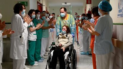 En una silla de ruedas y entre un pasillo de sanitarios aplaudiendo y cantando el Feliz cumpleaños ha salido Elsa del Hospital Gregorio Marañón este martes. Llevaba 315 días ingresada allí. Es la paciente de covid que más tiempo ha estado en el hospital madrileño. La mitad de sus 10 meses en el centro los ha pasado en la UCI, la mayor parte del tiempo sedada y con soporte ventilatorio. Sufrió todo tipo de complicaciones –trombosis, un infarto cerebral y distintas infecciones–, tanto que la doctora de medicina interna del Marañón Maria Eugenia García Leonis lo definió como “la expresión de todo lo grave que le puede pasar a un enfermo con covid”. Pero, a un día de cumplir 53 años, Elsa sale con ilusión y también un poco de miedo, para aprovechar la vida por la que tanto luchó.