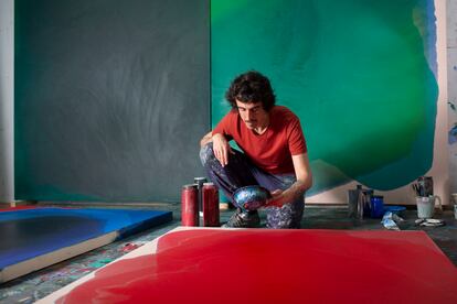 A pocos pasos de la Puerta de Alcalá los ventanales de la galería Fernando Pradilla inundan de luz la sala y dejan ver tres piezas abstractas y coloridas que dominan las paredes. Dos polípticos que forman una T y una cruz, y un cuadro monocromático de grandes dimensiones son las piezas estrella de la exposición Apóstoles. Tres estudios para una crucifixión del artista salmantino Rubén Rodrigo (Salamanca, 40 años) que se puede ver gratuitamente hasta el 27 de marzo; pero el tema religioso es solamente un punto de partida para la creación. Durante el confinamiento del año pasado Rodrigo se sumergió enteramente en su trabajo como escapatoria de la monotonía diaria. Con un ojo puesto en los grandes maestros, además de la temática general de los apóstoles en el arte clásico, decidió hacer una exploración de los colores para producir esta muestra que mantiene su técnica característica en sus versiones de obras canónicas de El Greco y Velázquez.