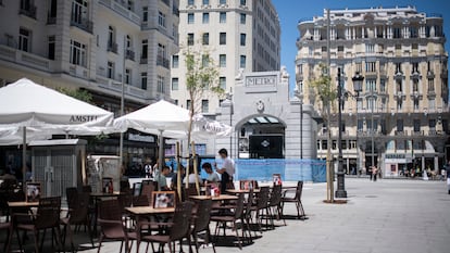 Tres amigos, compañeros de clase de interpretación, están paseando con un refresco en la mano y se paran en seco. “¡Hala! No la había visto terminada. Con las obras parecía mucho más pequeña la acera. Me parece elegante y señorial”, dice Demi Ferrá, la más entusiasmada. “¡Es un milagro! Ya era hora. No entiendo cómo han tardado tanto”, prosigue Ana Megía. El que falta por pronunciarse, Joseba Goyeneche, añade: “Es como de la Warner. Da una sombra estupenda y para la lluvia también nos sirve. Ahora solo falta saber cuánto tardarán con la plaza de España…”. Ante esa frase final, el trío se hincha a reír.