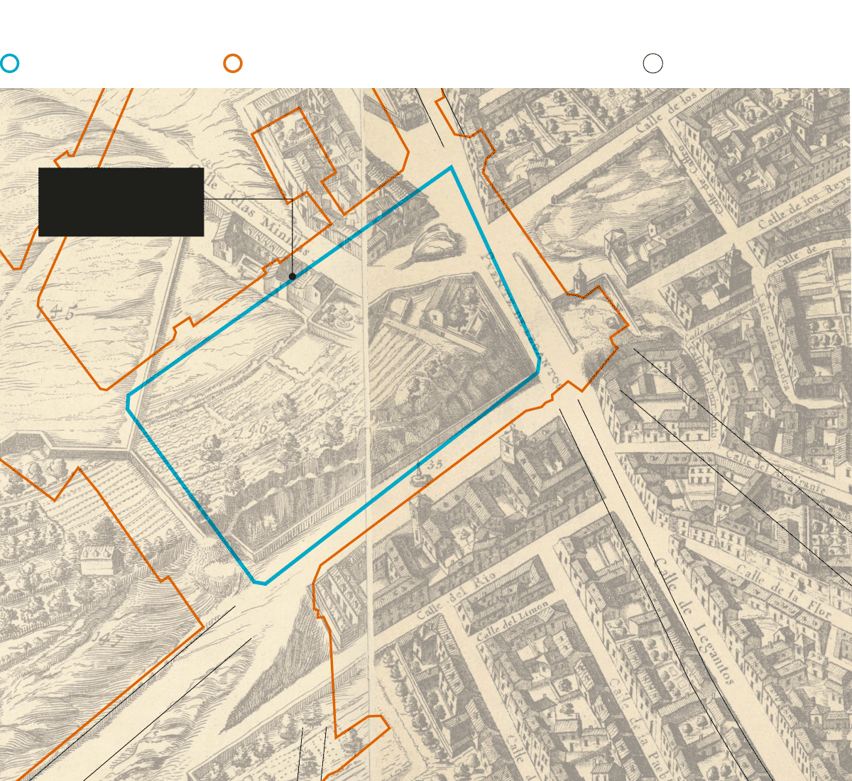 A mediados del siglo XVII, casi 100 años después de que Felipe II trasladara la corte de Toledo a Madrid, el espacio que ahora ocupa la plaza de España estaba situado en un hundido a las afueras de la villa. La parcela albergaba huertas y cultivos, según recogió con todo detalle el plano elaborado en 1656 por el cartógrafo portugués Pedro de Texeira (1595-1662) bajo encargo de Felipe IV. La parcela mantuvo las huertas durante 150 años más, hasta que Carlos III decidió el traslado del convento de San Gil desde la plaza de Oriente a este lugar.