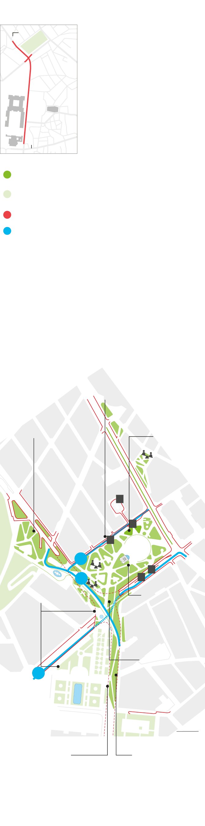 El lateral norte pasa a ser peatonal, si bien se mantienen los accesos a los aparcamientos subterráneos. Se clausura la entrada al túnel desde esta vía