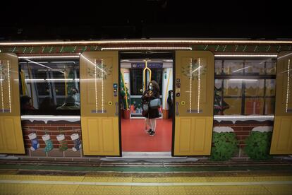 María Rodríguez, de 47 años, y Teresa Pérez, de 53, se subieron juntas en Moncloa. Para Rodríguez, ya es la segunda vez que se ha cruzado este lunes con el tren de la Navidad: “Cuando lo vi esta mañana, no me lo podía creer. Por fuera parece una caja de Navidad, es estupendo ir así a trabajar”. Los coches brillan por fuera con las luces —colocadas tanto en el perímetro de las ventanas y puertas como en la parte superior— mientras en las paredes exteriores, las pegatinas recrean los ambientes típicos de esta época del año.