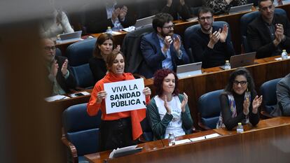 “Va a pasar a la historia por ser la única presidenta en sacar a un millón de personas [a manifestarse] en contra de su chapuza sanitaria y de su Gobierno”, le espeta Mónica García, la líder de Más Madrid. “Usted está cada día más nerviosa”, sigue. “Lo último es tratar de prohibir los carteles en los centros de salud. Exactamente, ¿cuál es el cartel que le molesta?”, pregunta. “¿El de no hay médico?, ¿el de no hay pediatra?, ¿el de no hay cita?, ¿el de no hemos construido el centro de salud que llevamos prometiendo desde hace 10 años?”, responde mientras enarbola un cartel en el que se lee, escrito en mayúsculas, “viva la sanidad pública”.