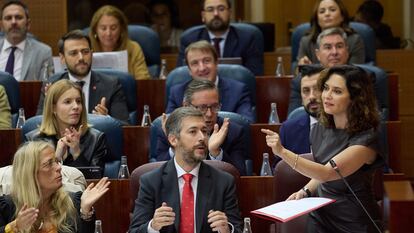 La lluvia golpea el techo de la Asamblea de Madrid, pero los rayos y los truenos están dentro del hemiciclo, donde este jueves se vive una sesión tormentosa, con acusaciones cruzadas alrededor del encausamiento del fiscal general del Estado, Álvaro García Ortiz; de los casos de corrupción del PP; y de las presuntas tramas que afectan ahora al PSOE. “El ciudadano está indefenso ante un Gobierno que utiliza prácticas mafiosas”, espeta la presidenta regional, Isabel Díaz Ayuso, sobre la causa abierta por revelación de secretos para esclarecer si García Ortiz tuvo que ver con la supuesta filtración a la prensa de un correo electrónico remitido a la Fiscalía por el abogado de Alberto González Amador, la pareja de la baronesa, a su vez investigado por la presunta comisión de dos delitos de fraude fiscal y uno de falsedad en documento mercantil.
