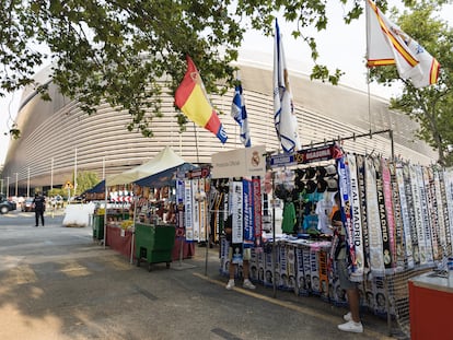 García compagina su trabajo de vendedora ambulante con otro puesto de comercial, pero insiste en que “muchas familias comen del Real Madrid y llevan toda la vida haciendo esto”. No solo salen perjudicados los que venden artículos promocionales del club, también los que tienen puestos de bebidas y frutos secos. “Si les cuestan 60 euros los sacos de hielo para mantener frías las consumiciones y hacen 120 euros de caja, pasan de abrir”, comenta la mujer.