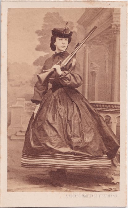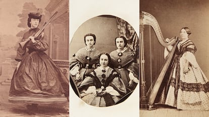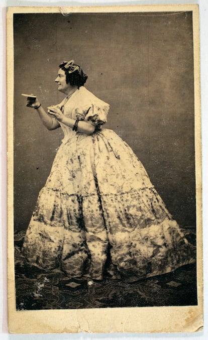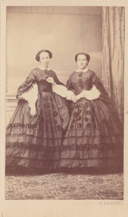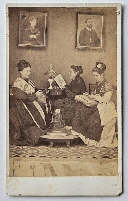 Una pequeña sala, un gran álbum de fotos ―152 exactamente―, una declaración de intenciones, muchos años de trabajo materializado. La exposición de un libro ―Retratadas (Cátedra, 2025), de Stéphany Onfray, comisaria de la muestra―, el libro de una tesis doctoral, la prueba palpable de mucha observación e investigación. No es una interpretación repentina de una imagen que se viraliza en redes, la muestra es un coqueto y romántico espacio ―ojo al papel de las paredes diseñado ex profeso― en el que observar lo que las mujeres españolas que se fotografiaban en las décadas centrales del siglo XIX nos querían contar. Porque sí, ellas, aunque lo tenían más difícil de lo que lo tenemos ahora, también eran sujetos activos, y también juzgados, claro.