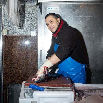-¡El salmón ha bajado 4 euros el kilo!- anuncia Héctor, pescadero ecuatoriano de 49 años.