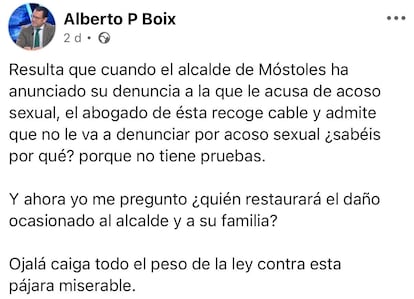 En el entorno más próximo a Bautista, que muestra un frente unido en el Ayuntamiento, han utilizado las redes sociales para directamente descalificar a la exconcejala. Alberto Pérez Boix, coordinador de Recursos Humanos, Hacienda y Presidencia del Ayuntamiento de Móstoles, ha escrito numerosos mensajes en sus cuentas de X y Facebook en los que habla de la exedil como “miserable pájara”. En otra publicó: “Igual más que una víctima, es una fresca”. Un día después de que estos mensajes salieran en medios de comunicación, Boix los ha borrado.
