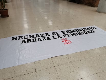 Los agresores trataron de colgar sin éxito una pancarta que, junto al símbolo de Falange, decía: “Rechaza el feminismo, abraza la feminidad”, de acuerdo con un comunicado de los dos decanatos de ambas facultades, que comparten el edificio. El personal de Políticas impidió la colocación y, junto con parte del equipo decanal, “expulsó a estas personas violentas”. El grupo también pegó adhesivos del Sindicato Español Universitario, la rama universitaria asociada a la Falange.