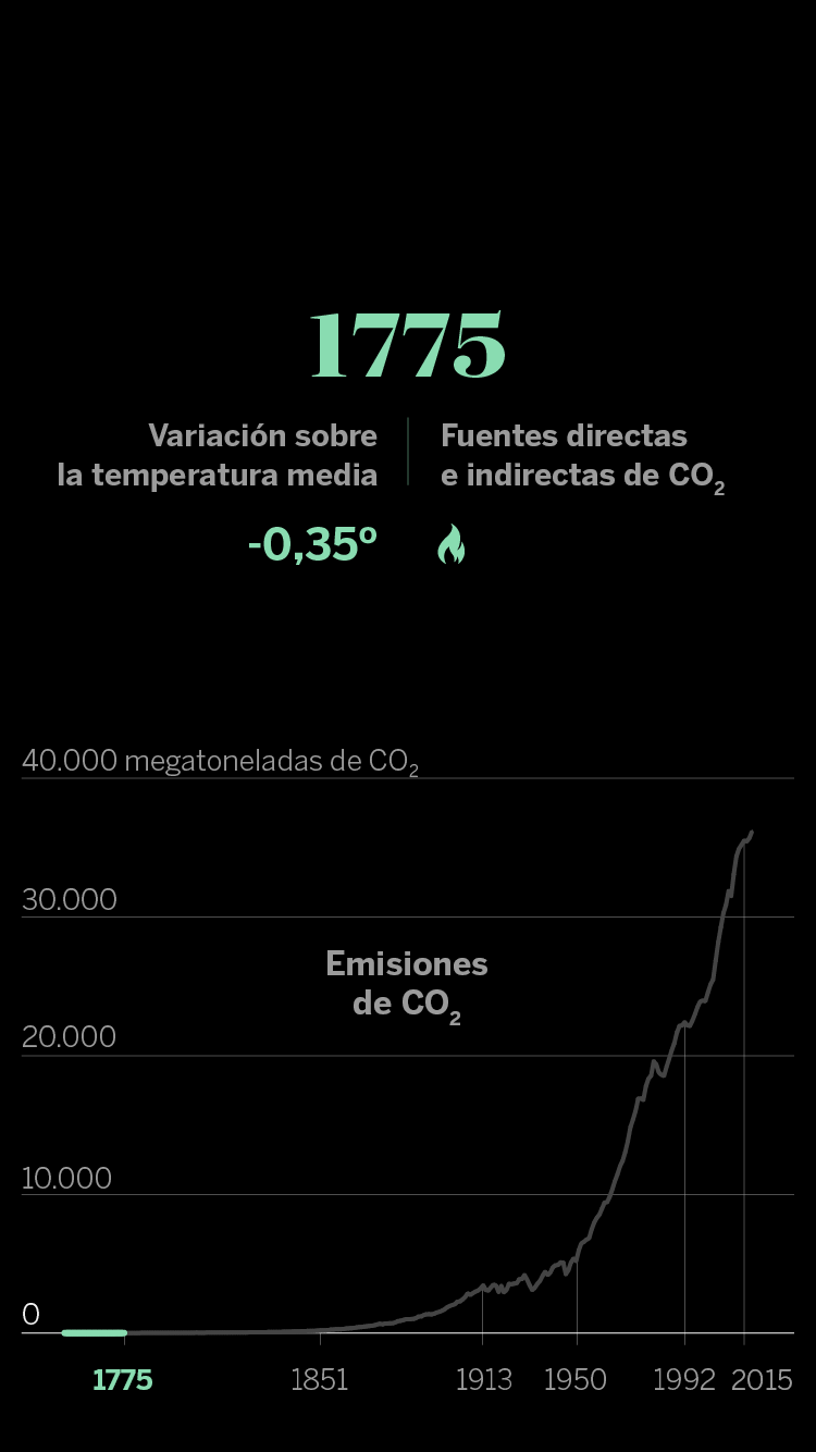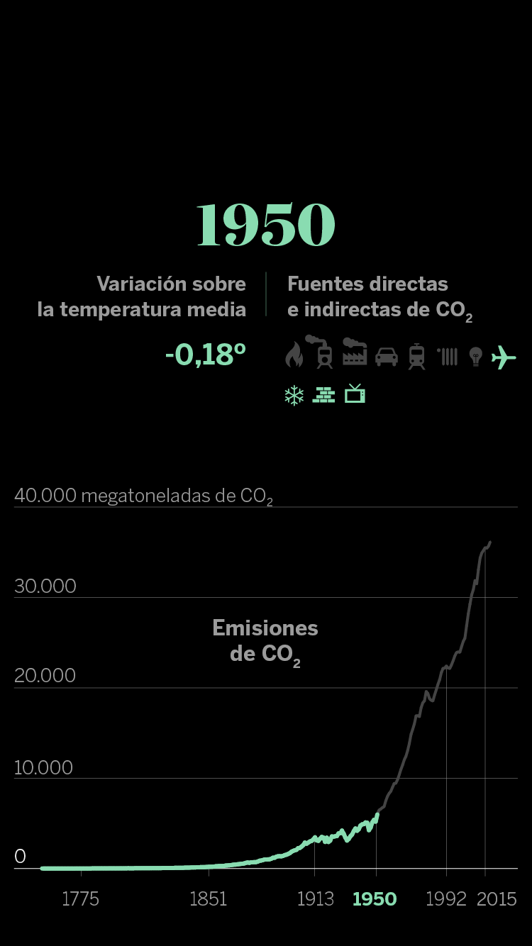 En cuanto a las infografías sobre la evolución del CO₂ vinculada a la acción humana, los datos de emisiones proceden del ‘Atlas del carbono’ del Global Carbon Project. En muchas ocasiones, esa relación se establece con las fuentes de energía (gas, petróleo y carbón, fundamentalmente) que, al quemarse, son las que emiten finalmente el dañino CO₂. Sin embargo, en este caso, para dejar más clara la relación entre causa (la acción del hombre en su vida cotidiana) y efecto (los gases), es preferible presentarlo con los principales adelantos tecnológicos y desarrollos sociales que, en cada periodo, han desencadenado aumentos exponenciales del consumo energético y, por lo tanto, de las emisiones.