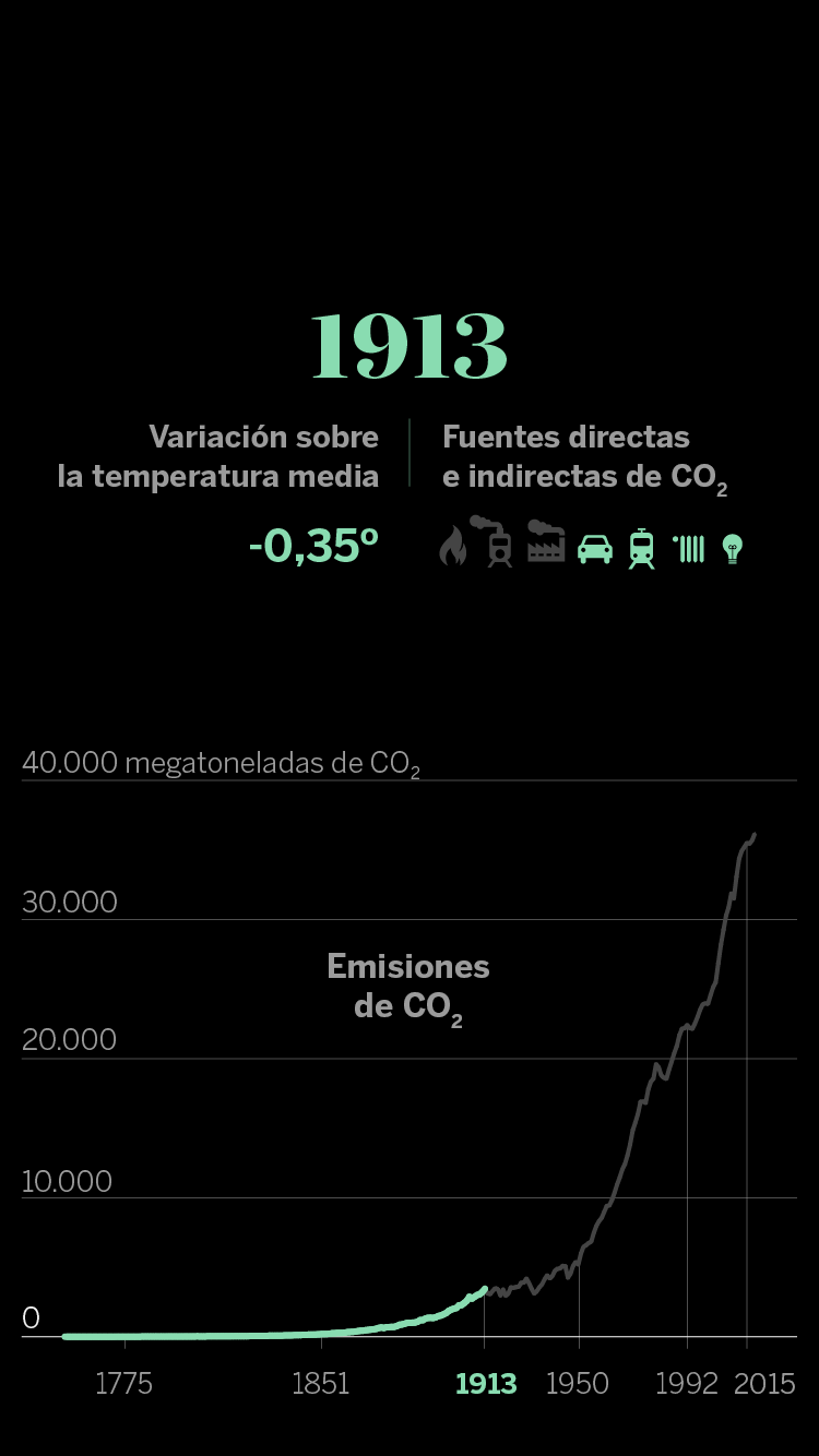 En cuanto a las infografías sobre la evolución del CO₂ vinculada a la acción humana, los datos de emisiones proceden del ‘Atlas del carbono’ del Global Carbon Project. En muchas ocasiones, esa relación se establece con las fuentes de energía (gas, petróleo y carbón, fundamentalmente) que, al quemarse, son las que emiten finalmente el dañino CO₂. Sin embargo, en este caso, para dejar más clara la relación entre causa (la acción del hombre en su vida cotidiana) y efecto (los gases), es preferible presentarlo con los principales adelantos tecnológicos y desarrollos sociales que, en cada periodo, han desencadenado aumentos exponenciales del consumo energético y, por lo tanto, de las emisiones.