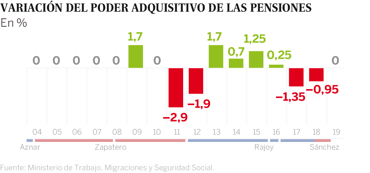 Durante la legislatura de Zapatero, el PSOE congeló las pensiones y los jubilados sufrieron en 2011 la mayor pérdida de poder adquisitivo en años, un 2,9%. Con Rajoy la revalorización media fue del 0,25%, pero los pensionistas perdieron capacidad de compra en 2012 (un 1,9% menos), en 2016 (1,35%) y en 2017 (0,95%).