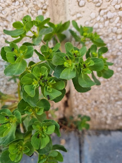 Un verde fresco alegra el día a cualquiera, parecen decir las inflorescencias de la lechetrezna. En la anatomía de esta planta herbácea se conjuntan unos verdes tan frescos y luminosos como se puedan imaginar, y ahora se encuentra en las calles de toda España. Esto es debido a que uno de sus rincones favoritos para crecer son las grietas de las aceras; allí, pegadita contra el muro de la zapatería, al lado de la puerta de la librería o en un alcorque tristemente abandonado.