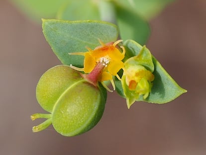 Y es que su relación con los insectos es muy estrecha, hasta el punto de engatusarles con sus semillas. Estas caen un poco más lejos de la planta madre mediante una pequeña explosión controlada, la llamada dehiscencia. Gracias a ella, el pequeño grano puede alejarse hasta un metro; toda una hazaña. En ese momento se darán dos escenarios distintos: o bien se quedará por aquel lugar, hasta que germine, o bien intervendrán las hormigas, porque cada semilla tiene un apéndice carnoso denominado carúncula, que está destinado exclusivamente a su dispersión. Esa carne vegetal es rica en lípidos y almidón, y a las hormigas les pirra; este es el premio que la lechetrezna reserva a esos insectos, que enganchan sus semillas para llevarlas más lejos de donde enraizó la planta madre. A dicho transporte especializado por parte de las hormigas se le llama mirmecocoria. Tal es el nexo entre esta especie y esos bichillos que se encuentran hormigueros bajo las euforbias.