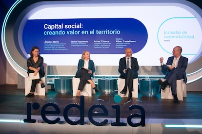 Para completar el mapa de miradas sobre sostenibilidad, la mesa Capital social: creando valor en el territorio reunió a representantes del mundo cultural para explicar cómo desde el patrimonio y los proyectos sociales se refuerza la cohesión territorial. Moderado por Albert Castellanos, consejero externo de Redeia, el diálogo tuvo lugar entre Ángeles Marín, directora general de Políticas contra la Despoblación del Ministerio para la Transición Ecológica y el Reto Demográfico; Isabel Izquierdo, directora del Museo Arqueológico Nacional; y Rafael Chueca, subdirector general de Cultura y Territorio de Fundación La Caixa.