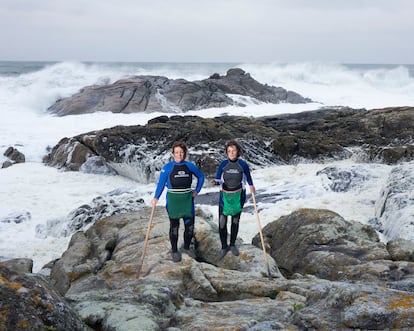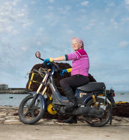Algo similar ocurre con las argaceiras, que recogían argazo —esas algas de color pardo que llegan a la orilla y se enredan en las rocas— y luego lo vendían como abono para el campo. “El de recolectora de algas es un oficio que aquí era muy tradicional y que está en extinción, un trabajo muy duro. La argaceira que yo fotografié hoy vende las algas que recoge a la industria cosmética, porque ya nadie las utiliza en el campo”. Subida a su moto y mirando decidida a cámara, la mujer que retrató Mar en la continuación de su proyecto Facedoras, esta vez en la zona del Baixo Miño, tiene más de 80 años y, cuando hizo la foto en 2020, todavía estaba en activo. “Es una imagen que le encanta a todo el mundo, pero cuando se la llevé a su casa, me dijo ‘la voy a esconder, porque como vean mis hijos que aún sigo trabajando en esto a mi edad, me matan’”.