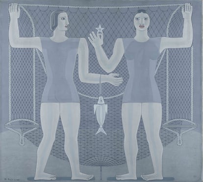 Puede que las regateiras de Mar Caldas recuerden a las de otra artista, concretamente Maruja Mallo —de la que acaba de inaugurarse una exposición retrospectiva en el Museo Reina Sofía—, y eso no es ninguna casualidad: Mar se inspiró en ella para crear algunas de sus fotografías y Maruja hizo los bocetos de la serie La religión del trabajo en Bueu, en el verano de 1936. Fue el último verano que la artista pasó en España antes de exiliarse cuando estalló la guerra. Con esos apuntes que tomó de las mujeres de Bueu realizaría, poco después, sus famosísimas pinturas. La serie está totalmente protagonizada por trabajadoras del campo y el mar, “esas mujeres musculadas, con mucha presencia, muy dueñas de sí que Maruja Mallo solía retratar”, cuenta Mar. Ambas artistas comparten el interés por el mundo del trabajo y Mar cree que “en las mujeres de Bueu, Maruja vio esa fortaleza y dignificación que tanto le fascinaban”.
