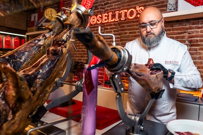Han pasado 35 años desde sus comienzos y, hace un par de ellos, hizo el ejercicio de contabilizar los jamones despiezados a lo largo de su carrera: más de 40.000. Estos días vive uno de los momentos de mayor intensidad del año. Inmerso en plena campaña de Navidad —el periodo de mayor consumo de jamón—, puede llegar a cortar hasta seis piezas en una sola jornada. A ello se suma haber ejercido recientemente como maestro de ceremonias en una exclusiva cata de añadas históricas —la más antigua, de 2006— celebrada en la Casa Batlló, en Barcelona. Dos días después recibe a EL PAÍS en la tienda de Joselito’s en Madrid, y la emoción por haber abierto una joya gastronómica de dos décadas de curación sigue intacta.