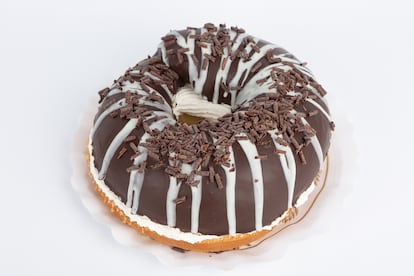 Así nació el rotauro, un bollo inspirado en el roscón de Reyes —la masa, de hecho, es la misma—, cubierto de chocolate y con una fina capa crema de avellanas en su base, que se puede rellenar de nata, crema o trufa. Vamos, como el roscón de toda la vida. “Cada mes de enero, el pueblo se llena de gente, vienen alrededor de 25.000 moteros, y mi padre pensó que teníamos que aprovechar el tirón”, explica Álvaro Galicia, hijo del ideólogo del rotauro y sexta generación al frente de esta pastelería con 175 años de historia.
