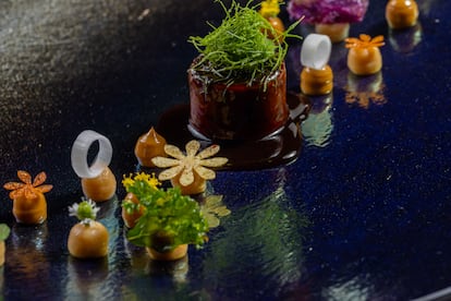 La segunda secuencia es elocuente en mostrar cuatro tesoros del mar Mediterráneo, recuperando, por ejemplo, un sublime plato de 2022, como es el de atún, que le sirve Balfegó, compuesto por una lámina de otoro (la parte más cotizada de este pescado), con merengue de algas y una emulsión anisada de sus espinas. Para la sardina, que presenta curada, prepara una lámina cristalizada de pimiento asado, con emulsión de esta verdura y queso de leche cruda. El cangrejo azul lo presenta en un cilindro de espirulina y alga nori, con el cangrejo aliñado y servido con sus propios corales. Por último, el cabracho lo prepara con un caldo gelificado, un pastel del mismo pez, huevas y una salsa cóctel. En su propuesta marina hay una ensalada avinagrada de marisco al palo cortado, bogavante, un salmonete y, como en todo menú degustación que se precie, no falta el omnipresente caviar, que prepara con almendra y vainas de guisantes.
