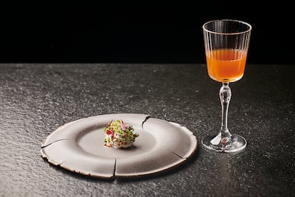 Su cocina, fundamentalmente la del gastronómico Oba que tienen en Casas-Ibáñez, también dialoga con su territorio. La inspiración del nuevo menú parte de un libro concreto: Las 1000 recetas de la cocina de Albacete y su provincia, de Carmina Useros. “Lo publicó en 1971 tras recorrer casa por casa recopilando recetas. Nos hemos inspirado en estas recetas perdidas para los pases”, explican. Las llevan a la cocina de vanguardia con técnicas contemporáneas y con el objetivo de recuperar un conocimiento que forma parte de su entorno. “Nos dan ganas de replicar algunas para que los chicos conozcan de verdad qué es la gastronomía del pueblo y de la zona. Ves el libro y flipas porque hay una cantidad de cosas que no te imaginas… cocina de pastores, guisos… es brutal”, dice Juan. La idea es llevar ese legado también al presente. “Nos gustaría que fuera la comida del personal. Es un reto maravilloso”.