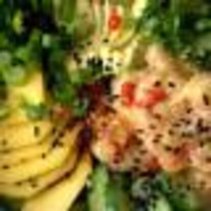 Si coges un montón de frutas tropicales y las tratas como si fueran hortalizas, consigues una ensalada campeona. Añade unos langostinos, no te arrepentirás.