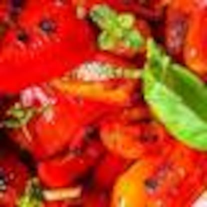 Si tienes una plancha, un wok o, mejor aún, vas a hacer una barbacoa el domingo, puedes hacer esta ensalada. Los tomates y pimientos asados no necesitan más que un buen aliño.