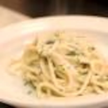 Un clásico italiano versionado: el ajo va blanqueado y emulsionado con agua para obtener una crema suave. Estos espaguetis te harán decir mamma mia!