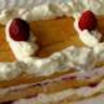 Este pastel une el zumo de naranja, las fresas con leche condensada y ese pico de Europa de la repostería cántabra que son los sobaos pasiegos.