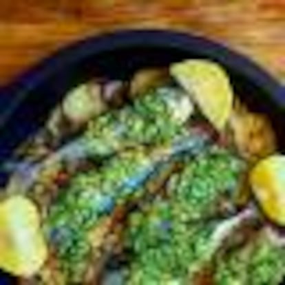 Cocinamos la caballa sobre un lecho de patata y cebolla, usando una cazuela baja en lugar del horno. Conseguiremos un plato reconfortante sin pasar calor, y lo refrescaremos con una picada de perejil y almendra.