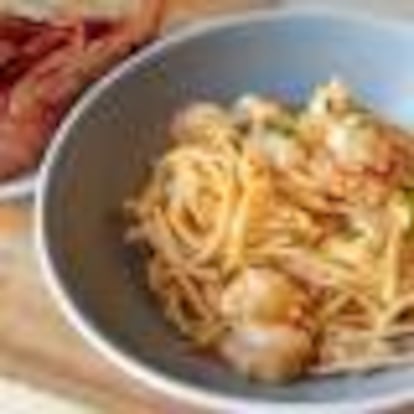 La 'carbomare' es una versión de este clásico italiano que sustituye el guanciale por ingredientes como navajas y gambones. Rematan un aceite aromatizado con sus cabezas y la cremosidad de la yema de huevo.