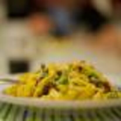 Adaptamos la carbonara de toda la vida sustituyendo la panceta por cecina, y añadiendo un poquito de verde de temporada en forma de guisantes.