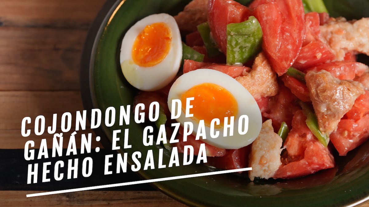 Aunque suene a receta de casquería, el cojondongo de gañán es comida vegetariana tradicional. Tomate, pimiento verde, pan y huevo se juntan en una combinación fantástica para el verano.