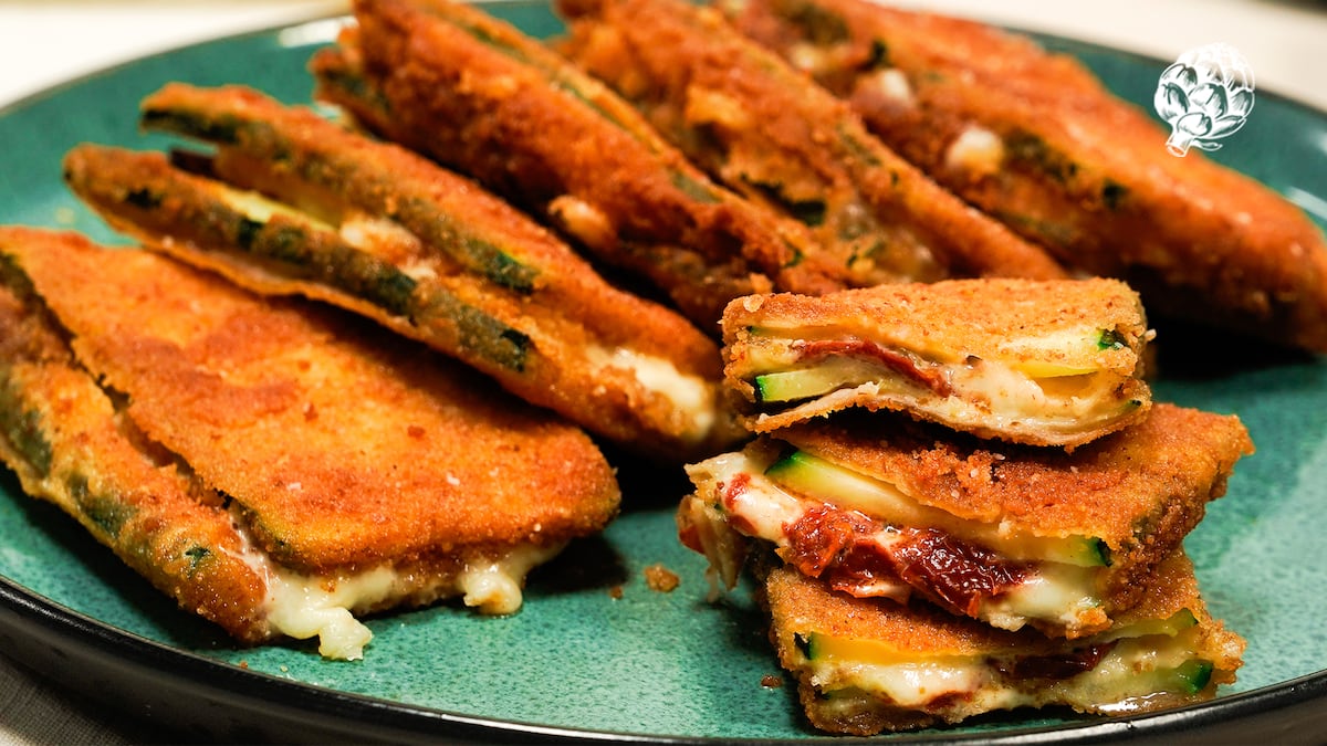 La hortaliza es perfecta para este tipo de preparación porque, cortada en láminas, permite hacer una especie de sándwiches con queso y otros ingredientes que son fáciles de empanar y freír. El calabacín no ofende a nadie con su suavísimo sabor, pero sí necesita un poco de animación para no resultar aburrido. Además de con el queso, aquí se la hemos dado con unos tomates secos, que añaden el necesario punto salado a la fiesta.