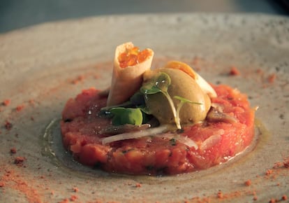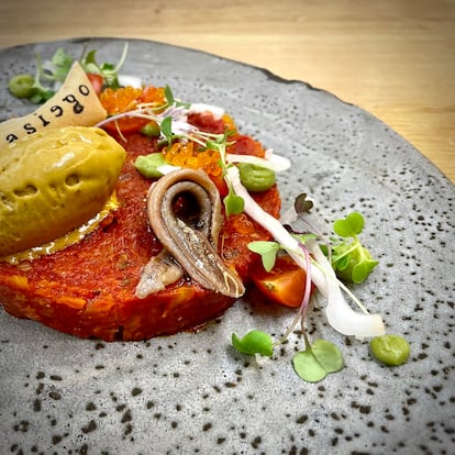 Javi Matinero precisa que la primera de esas dos recetas es una creación propia que los acompaña desde que arrancó Trasiego: “Nace de la voluntad de disfrutar el tomate rosa, un producto de temporada, durante todo el año. Así que lo rodeamos de encurtidos y de anchoas y lo rematamos con ese original helado de escabeche de mejillones que nos proporciona un productor local estupendo, Helados Elarte, una empresa artesana de la sierra de Guara”.