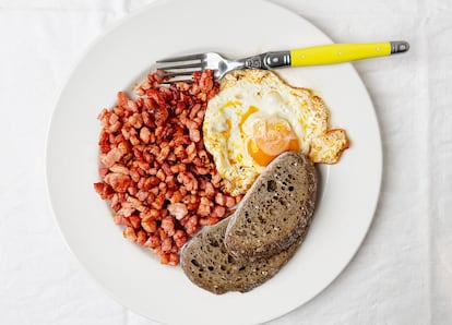 Retirar la carne con una espumadera y freír los huevos en la grasa restante (agregar algo de aceite de oliva si no fuera suficiente).