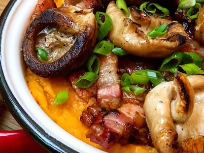 Una oda a la temporalidad otoñal que llena el plato de color y sabor: el boniato se viene arriba con las especias del Ras el Hanout, el shiitake le sube la potencia y cebolla dorada con panceta remata la jugada.