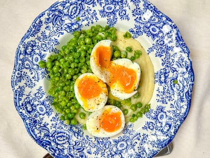 Una base cremosa, unos guisantes cocinados al punto y la yema del huevo como salsa que lo mejora todo: esta combinación primaveral no tiene fallo