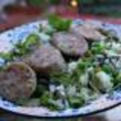 El cordero sirve como acompañamiento de una sémola hidratada en frío y un buen montón de verduras y hierbas, en un plato que podríamos definir como 'flexitariano canónico'.