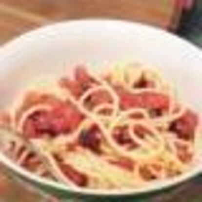 Estamos en verano. Hace calor. ¿Por qué no tomar los espaguetis fríos como si fueran una ensalada? En esta receta les ponemos tomate. Y, por qué no, chorizo.