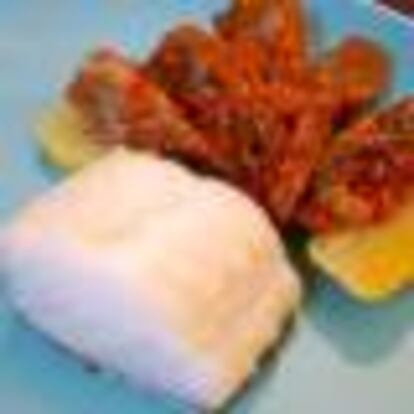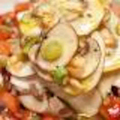 Cuece las patatas al vapor, envuelve las alcachofas en una salsa de tomate y frutos secos, confita el bacalao y junta los tres elementos: puro y delicioso.