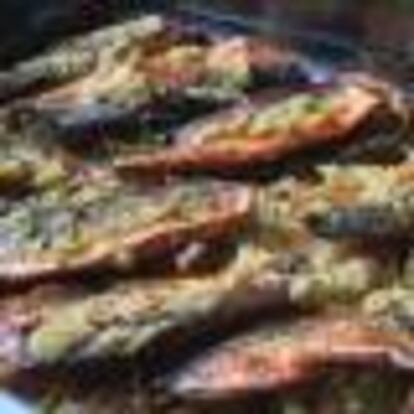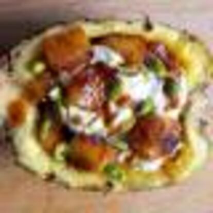 Un lecho de fina patata crujiente con tomillo y chalota, coronado por una sabrosa caballa regada con una salsa de ajo asado y limón.