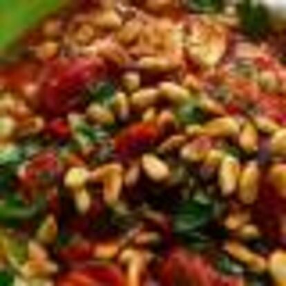 UNTABLE DE YOGUR, TOMATES CHERRY CONFITADOS Y PIÑONES