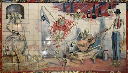 Además, han llegado hasta nosotros intervenciones de fantasía como una danza macabra imaginada por el artista Carlos González Ragel. “Él no era ceramista, sino pintor, y antes fotógrafo, oficio heredado de su padre en Córdoba”, comenta Riera, que se ha hecho un completo curso de historia y arte ante la que se le viene encima. ”Su obra se caracteriza por las llamadas ‘esqueletomaquias’, escenas costumbristas y retratos protagonizados por esqueletos. Aunque goza de reconocimiento y sus cuadros se venden en galerías, la pieza en azulejo de Los Gabrieles es excepcional. Él realizó el boceto y un ceramista se encargó de trasladarlo”.